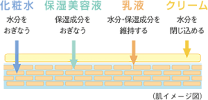 洗浄後そのままにしておくと、お肌は乾燥します。洗浄後はすぐに保湿剤で水分を補いましょう。さらに乳液、クリームなどを重ねて使い、お肌の表面に油分の膜を作り、水分の蒸発を防ぎましょう。水分と油分のバランスを整え潤いのある健康な状態を保てます。